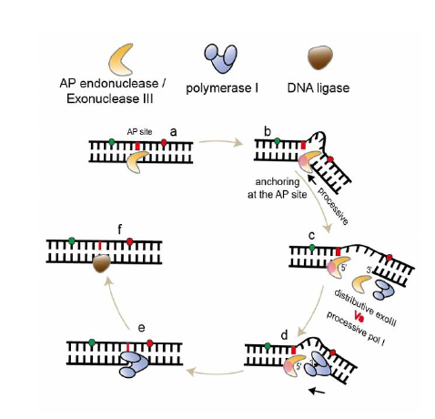 연구팀은 단일분자 형광관찰 기술을 이용하여 핵산절단효소가 특정 부위(AP 부위)를 절단하는 시점에 복구가 시작되고, 그 후 AP 부위에 강하게 결합하여 손상 부위로부터 DNA를 빠르게 제거하며 단일가닥 DNA의 강성(rigidity)에 의해 최소한의 DNA 틈새 크기로 조절됨을 실시간으로 관찰했다. 무작위로 DNA를 분해하는 일반 핵산절단효소와 달리 AP 핵산절단효소는 AP 부위에 강하게 고정되어 해리되지 않고, 연속적으로 DNA를 분해하여 빠르게 DNA 틈새를 만든다는 것이다. 나아가 일시적으로 생성된 DNA 틈새 구조는 DNA 중합효소가 작동할 공간을 제공하였고 이 과정이 정교하게 시공간적으로 조절됨을 규명하였다.