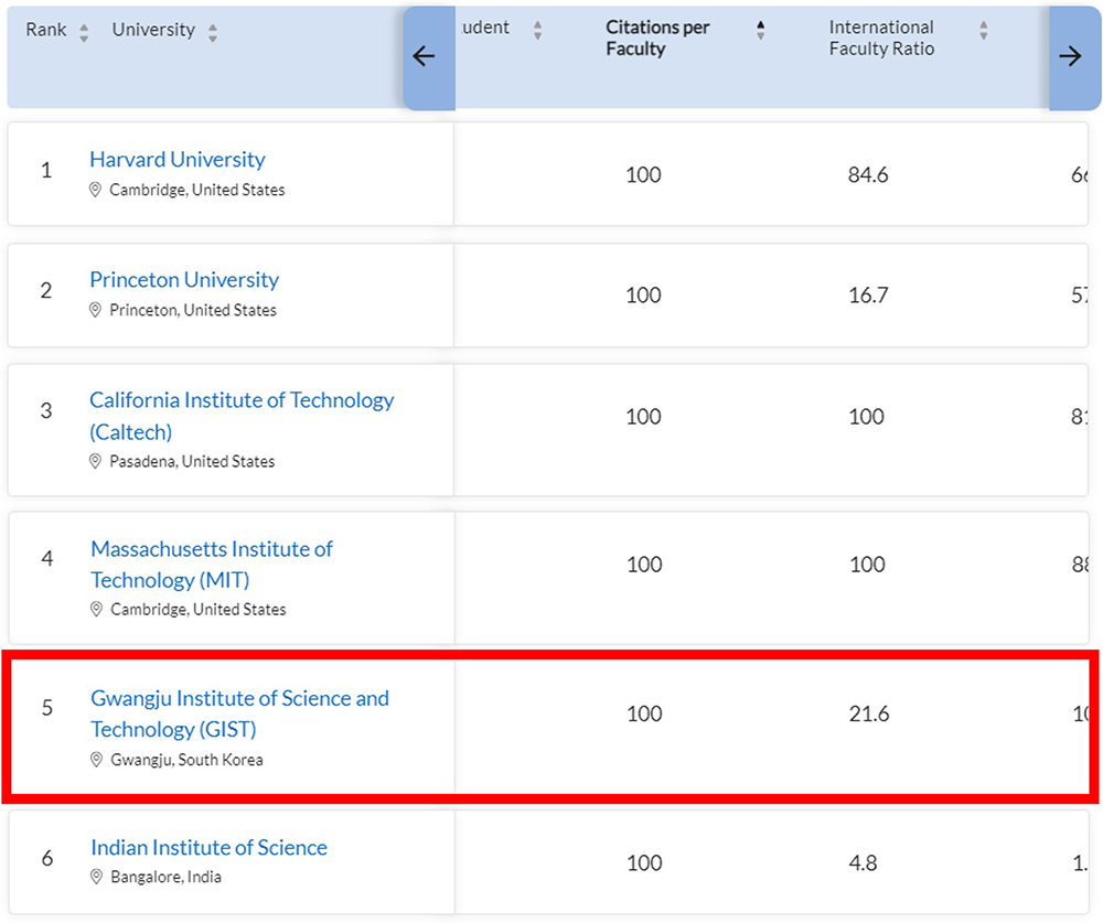 GIST가 2024 QS 세계대학평가(QS World University Rankings 2023)의 ‘교수 1인당 논문 피인용수(Citations per Faculty)’ 부문에서 국내 1위 및 세계 5위로 평가됐다. QS세계대학평가는 영국 글로벌 대학평가 기관인 QS(쿼커렐리 시먼즈, Quacquarelli Symonds)에서 매년 6월 발표하는 순위로, 올해는 한국 시각 기준 6월 28일 오전 5시에 발표됐다. 지스트는 2008년 이후 16년 연속 국내 1위로 평가됐으며, 세계 대학 중에서도 줄곧 2위에서 6위 사이를 기록하며 세계 TOP 10의 최상위권을 유지해 세계 정상급 연구 역량을 인정받고 있다. ‘교수 1인당 논문 피인용 수’는 해당 대학 연구자들의 논문이 다른 연구자들에 의해 얼마나 많이 인용되었는지를 나타내는 지표로, 대학 연구 역량의 양(量)과 질(質)을 모두 평가할 수 있는 항목이다.