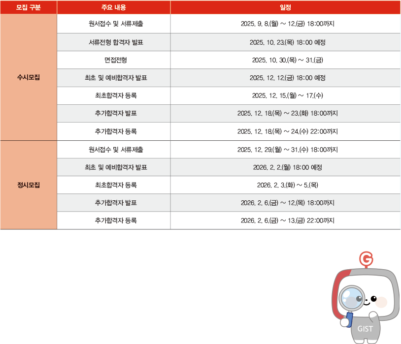 - 최종 합격자 발표 시, GIST ‘반도체공학과’로 소속학과가 확정되며, 해당 학과의 정원이 초과될 경우 인문사회과학부로 배정될 수 있음