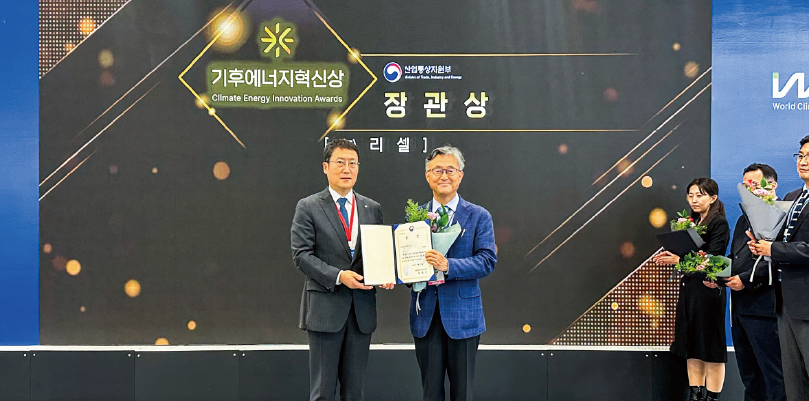 신소재공학과 이광희 교수가 창업한 ㈜리셀이 ‘제2회 기후에너지 혁신상’에서 산업통상자원부 장관상을 받았다. ㈜리셀은 기존 실리콘 태양전지의 한계를 극복, 초경량·유연·투명성을 갖춘 ‘유무기 하이브리드 태양전지 필름’을 개발, 건물 벽과 창문, 자동차 지붕 등 다양한 표면에 적용할 수 있다. 롤투롤 습식 공정을 활용해 가격 경쟁력과 대규모 생산성을 확보했으며, 실내광전지와 영농형 태양전지 등으로 확장이 가능하다. 이 대표는 “독보적 기술력으로 글로벌 친환경 에너지 시장을 선도하고 국내 기후산업 생태계 발전에도 기여하겠다.”고 밝혔다.