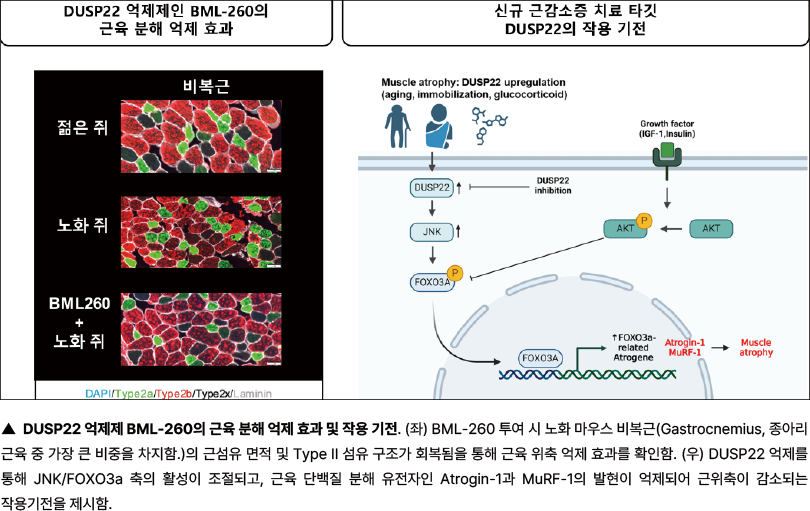이번 연구는 DUSP22가 근육 위축을 유도하는 병리적 기능을 세계 최초로 규명하고, 이를 표적으로 한 약물 전략이 근감소증뿐 아니라 다양한 근육 퇴행성 질환 치료에도 활용될 수 있음을 보여준다. 연구팀은 이번 성과가 근육 소실의 기전을 이해하고, 근감소증 치료제를 개발하는 전환점이 될 것으로 평가했다. 연구 결과는 국제학술지《EMBO Molecular Medicine》에 게재됐다.