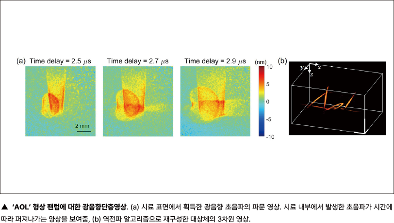 GIST 이병하 교수팀과 고려대 최원식 교수팀이 광음향 원리에 기반한 세계 최초 초음파 신호 영상화 및 3D 복원 기술을 개발해 3차원 생체 촬영에 성공했다. 레이저와 광학 센서만으로 초음파를 발생·감지해 최대 5mm 깊이까지 비접촉 고해상도 3D 이미지를 구현했으며, 기존보다 10배 빠른(1초 이내) 영상화가 가능하다. 이 기술은 뇌혈관·종양 진단, 반도체·원전 비파괴 검사 등에 활용될 수 있다.