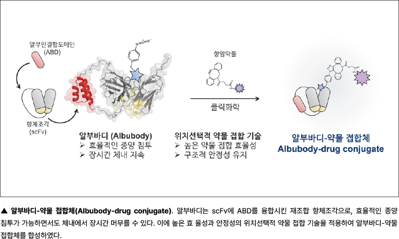 연구팀은 클릭화학 기반 위치선택적 약물 접합 기술을 적용해 약물이 항체조각에 정확하게 결합하도록 설계함으로써 합성 효율과 안정성을 높였다. 소형 단백질의 빠른 조직 침투 특성과 알부민의 장기 체류성을 결합한 결과, 기존 항체조각 기반 항체-약물 접합체(ADC)가 갖던 종양 침투 한계와 짧은 반감기 문제를 동시에 극복할 수 있음을 확인했다.