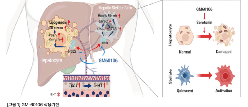 GM-60106은 경구 투여가 가능한 저분자 혁신 신약 후보 물질로, 말초 세로토닌 HTR2A 수용체를 선택적으로 억제해 간 내 지방 축적과 섬유화를 동시에 억제하는 이중 작용 기전을 가지고 있습니다. 또한, 세로토닌계 약물에서 나타날 수 있는 중추신경계 부작용(예: 우울증)을 최소화하기 위해 혈액-뇌 장벽(Blood-Brain Barrier) 투과를 낮추도록 설계했습니다.