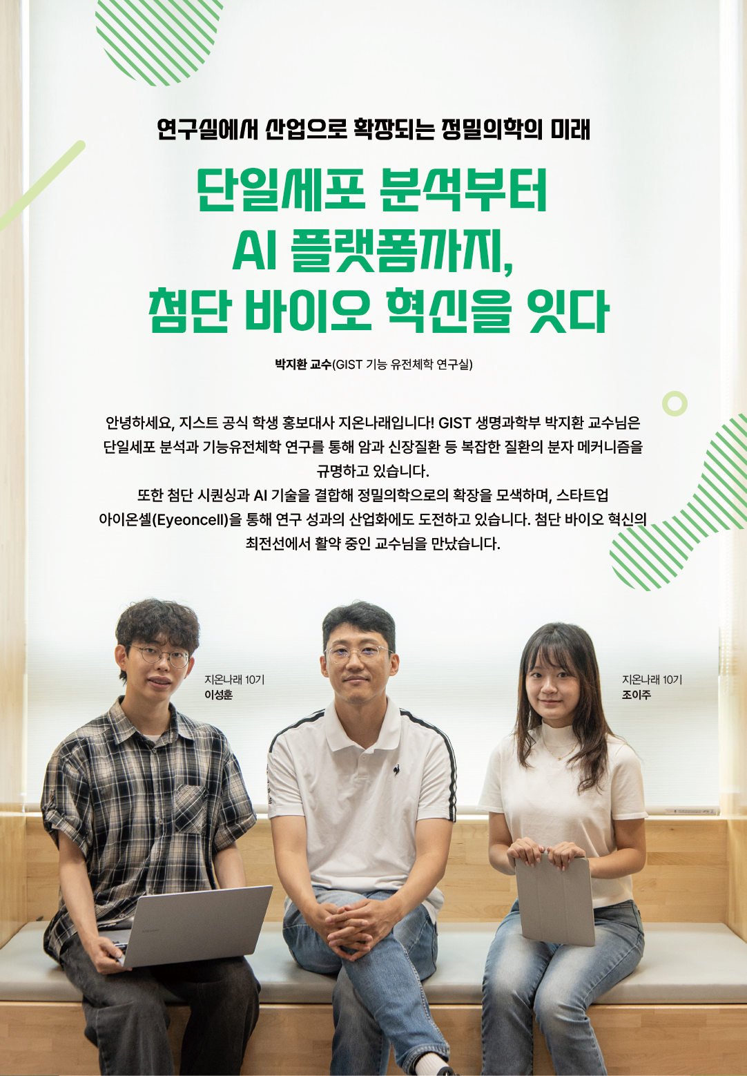 이번 인터뷰를 통해 첨단 바이오 연구가 실험실의 경계를 넘어 산업과 사회로 확장되는 과정을 직접 느낄 수 있었습니다. 데이터와 기술, 그리고 사람을 잇는 연구자 박지환 교수님의 여정은 GIST가 그려가는 정밀의학의 미래와 맞닿아 있었습니다. 앞으로 교수님과 연구진이 만들어 갈 새로운 혁신을 기대해 봅니다.